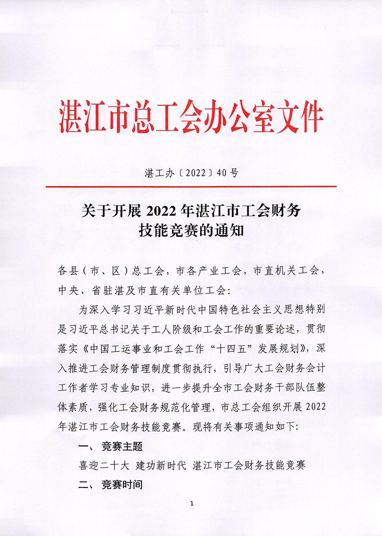 关于开展2022年湛江市工会财务技能竞赛的通知 来源:湛江市总工会 发布时间:2022-07-12 10:52:58 浏览次数: 次 【字体:小 大】 关于开展2022年湛江市工会财务技能竞赛的通知 终审:谢明春 分享到: 【打印正文】